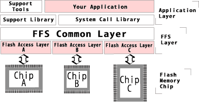 また、フラッシュメモリに依存する部分を、Flash Access Layer(FAL)として切り分けた構造を持ち、