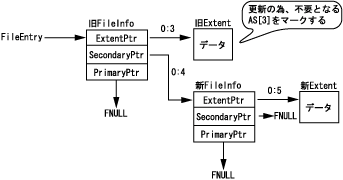 このようにすることによってデータの更新を行います。SecondaryPtrは構造体が更新された時に更新後の構造体へのリンクを張るときに使用するポインタです。この時旧 Extentは不要になります。