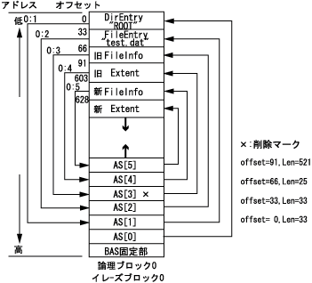 たとえば、"test.dat"が削除されたとすると、FileEntry, FileInfo, Extentは不要になります。